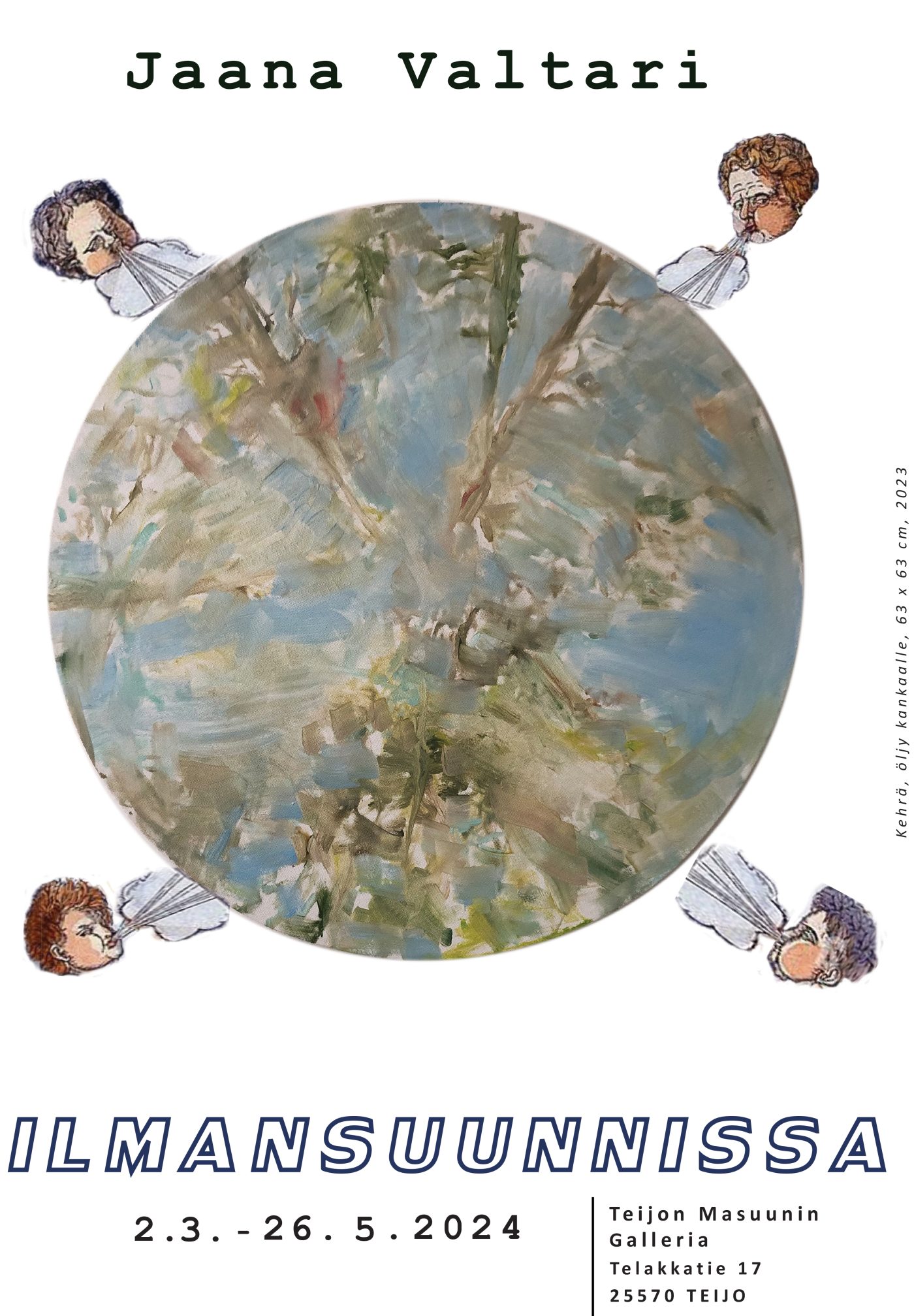 2.3.-26.5.2024 Galleriassa Jaana Valtarin vaellusteemaisia maalauksia viime vuosilta. “Monissa maalauksissani on ihmis- ja eläinhahmoja vaeltamassa rannalla tai vuorilla. Maisema on usein kuvattu lintuperspektiivistä, joka paljastaa ihmisen vähäpätöisyyden maisemaan verrattuna. Ihmiset ja eläimet suuntaavat laumoina kohti parempia elinolosuhteita, usein kohti merta. Kaikissa maalauksissa ei ole vaeltajia näkyvissä, mutta he ovat läsnä katsojina. Teokset kuvastavat vaeltajien näkemää maisemaa, joko todellista tai mielen sisäistä. Teokset edustavat näiden ilmansuuntien tarjoamia mahdollisuuksia.”