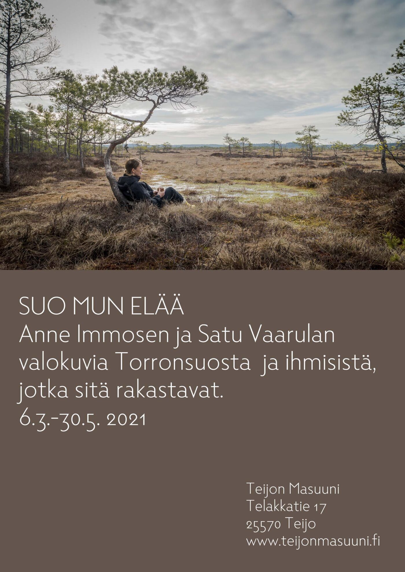 6.3.-30.5.2021 Anne Immosen ja Satu Vaarulan kuvia Torronsuosta ja ihmisistä, jotka sitä rakastavat Teijon Masuunin aulassa ja kahvilassa. Valokuvanäyttelyssä päätähtenä on huikaisevan kaunis suo, sen yksityiskohtien runsaus ja ehtymättömyys. Suolla on kuvattu myös ihmisiä, joille se on rakas.
