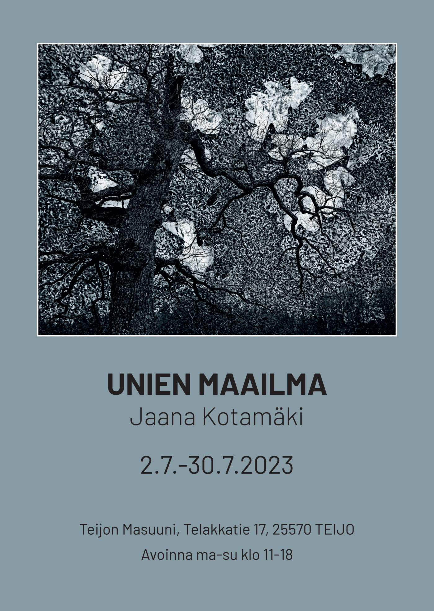 2.7.-30.7.2023 galleriassa palkittun turkulaisen valokuvataiteilijan Jaana Kotamäen teoksia. Näyttelyn idea lähti liikkeelle eräänlaisista unenomaisista maailmoista, joissa kaikki on mahdollista. Visuaaliset aiheet ovat löytyneet luonnon muotojen, linjojen sekä tunnetilojen siivittäminä ja vievät johonkin toiseen todellisuuteen. Kuvien sisältö on vapautettu luovilla kuvaustekniikoilla ja samalla on vapautunut myös taiteilijan oma mieli. Ja näin kuvapinnalle on syntynyt aivan uusia maailmoja, vieden sekä unien myyttiseen maailmaan että lapsuuden mielikuviin.
