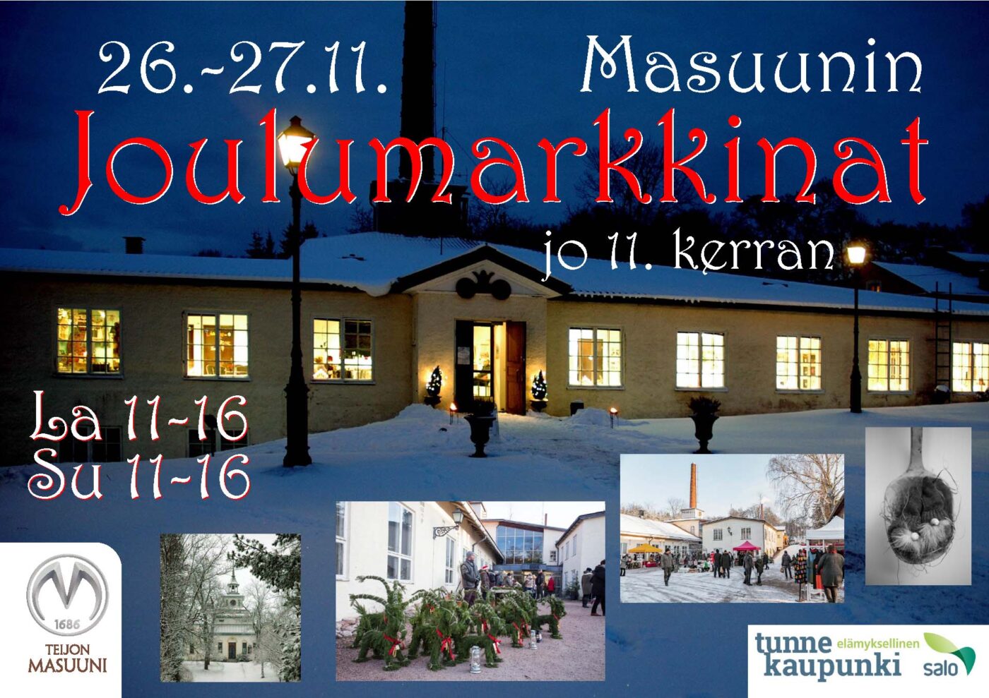 Teijon Masuunin perinteiset kaksipäiväiset käsityöläisten Joulumarkkinat järjestetään nyt jo 11. kerran marraskuun viimeisenä viikonloppuna Teijon idyllisessä ruukkikylässä Salossa. Tänäkin vuonna markkinoilla on myynnissä yli 80 kädentaitajan töitä Masuunin lämpimissä sisätiloissa sekä tunnelmallisella sisäpihalla; laadukkaita käsityötuotteita, taidetta, lähiruokaa, leivonnaisia, joulukoristeita, kransseja, ym.