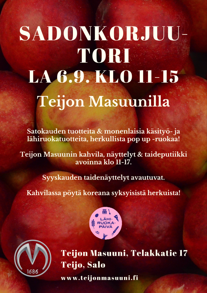 Teijon Masuunin syyskausi avataan lauantaina 6.9. syksyn taidenäyttelyiden ja perinteisen Sadonkorjuutorin merkeissä. Nyt jo kuudetta kertaa järjestettävä Sadonkorjuutori on osa valtakunnallista Lähiruokapäivää.